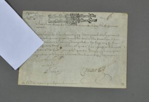 Simon HURTRELLE (1648-1724), sculpteur, élève du Bernin, membre de l'académie, il travailla sur les chantiers de Marly et de Versailles. Pièce signée. 1 p. in-8 sur parchemin. Paris, 8 juin 1695. Reçu de 165 livres comme " sculpteur ordinaire du Roy " pour une rente constituée sur la gabelle. Très rare.