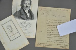 François-Frédéric LEMOT (Lyon 1771-1827), sculpteur. Lettre autographe signée au marquis de Marbois. 1 p. in-4. Paris, 25 septembre 1825. Sur la statue équestre de Louis XIV de la place Bellecour. " Je viens de terminer en bronze à la fonderie du Roule, la statue équestre de Louis XIV destinée pour la ville de Lyon. Je désire vivement recueillir vos observations sur ce monument important avant son départ, qui aura lieu samedi prochain, et si vous daignez la visiter, je serai infiniment reconnaissant de cette nouvelle preuve de bienveillance et de cet intérêt particulier, dont vous avez eu la bonté de me donner tant de preuves [] ". [La statue sera inaugurée le 6 novembre 1825]. On joint 2 portraits gravés.