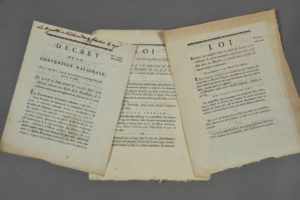 [LOUVRE (MUSÉE DU)]. 3 imprimés révolutionnaires. Paris, " de l'imprimerie nationale exécutive du Louvre " Trois documents relatifs à la création du Musée du Louvre. " Loi relative au transport dans le dépôt du Louvre, des tableaux & autres monuments des beaux-arts, qui sont dans les maisons ci-devant dites royales & autres édifices nationaux " (19 septembre 1792, 2 pp. in-4). " Loi relative au triage & à la conservation des statues, vases & autres monumens des arts qui se trouvent dans les maisons ci-devant royales & autres édifices nationaux " (16 septembre 1792, 4 pp. in-4). " Décret de la Convention nationale du 21e jour du 1er mois de l'an second, qui accorde un fonds annuel de 100,000 livres, pour dépenses relatives au Musée de la République & à d'autres objets qui intéressent les sciences & les arts " (2 pp. in-4, cachet rouge " au nom de la République française " et griffe de Gohier).