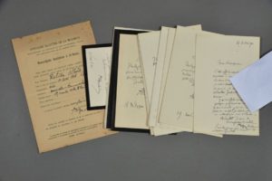 Albert ROBIDA (1848-1926), illustrateur, caricaturiste et romancier. 19 lettres autographes signées au docteur Goubert. 19 pp. in-8. Le Vésinet, 1893-1902. Correspondance amicale, réponses à des invitations aux dîners de La Marmite, travaux d'illustration. " Le menu sera fait pour les premiers jours de novembre, je commencerai ces jours-ci, si vous n'avez aucune indication particulière à me donner []. Je vous envoie deux dessins. J'espère bien le mois prochain n'avoir pas de nouvelle tuile []. Voici le menu. J'ai fait le préfet en chevalier du guet, à la tête de ses archers en patrouille dans une rue du vieux Paris (l'hôtel dans le fond est exact) et pour terminer le cadre une vue du Palais []. Pouvez-vous 'inscrire pour le dîner de vendredi. Vous serez bien aimable de me placer avec le groupe Laffont-Mariani. Je vous en serais fort obligé. Je vous enverrai ces jours-ci les dessins pour l'Album de la Marmite [] ". On joint une souscription à l'Annuaire illustré de La Marmite, complétée et signée par Robida.