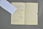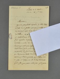 Charles THÉVENIN (1764-1838), peintre néo-classique. Lettre autographe signée à Chambellant, trésorier de la Maison du Roi à Rambouillet. 2 pp. in-8. Paris, 2 août [1828]. Adresse au dos. Restauration d'un tableau lacéré pour la Maison du Roi à Rambouillet. Il donne des nouvelles de l'opération de rentoilage du tableau. " Elle est terminée maintenant et matériellement le dommage est réparé ; il faut repeindre à présent les parties où la lacération a enlevé les couleurs ; j'ai confié ce travail, qui est le plus difficile, à un artiste très habile dans ce genre ; mais il faut du temps pour ces raccords, il y faut revenir plusieurs fois et attendre que les premières teintes soient sèches ; ce qui fait, monsieur, qu'il est impossible que le tableau soit en place à l'époque où M. le curé désirerait qu'il y fût []. J'ai donc tout lieu d'espérer que cette restauration sera aussi parfaite que le mauvais état du tableau l'aura permis ".