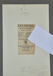 ACADÉMIE FRANÇAISE. Jean BALLESDENS (1595-1675), avocat et bibliophile, élu à l'académie en 1648. Signature autographe sur la page de titre (détachée) des Muses illustres (édition de 1658). Fixée sur un feuillet plus grand. Provient de l'ancienne collection de René Kerviller (mention autographe signée, 1881).