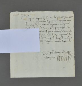 ANTOINE DE LORRAINE (Bar-le-Duc 1489-1544), duc de Lorraine, dit Le Bon, fils de René II. Lettre signée avec une ligne autographe, au sénéchal d'Agenais (Pothon de Raffin). 1 p. in-4. Nancy, le pénultième de septembre (vers 1530-1540), adresse au dos. Très beau filigrane au blason fleurdelysé. " Monsieur le seneschal j'ay receu vos lettres par vostre homme présent porteur et pour m'acquitter de promesse, par luy vous envoye deux lasniers [oiseaux de la famille des faucons] pour bailler de passe-temps à l'Antiquité. Vous leur apprendrés le mestier selon l'âge et vouldroys qu'ilz fussent telz que les demandés car en cela et plus grant chose vous vouldroys faire plaisir. Le sceit Dieu que je prie, Monsr le Seneschal vous donner ce que désirés ". Mention en haut de la lettre " inutile à la terre d'Azay " [le sénéchal d'Agenais, Antoine (dit Pothon) de Raffin, capitaine des gardes du corps du roi, reçut le château d'Azay le Rideau des mains de François 1er en 1535]. Les laniers sont des faucons. Ils seront ici dressés pour la chasse. Dans le Cinquième Jour de la Sepmaine, le poète gascon Guillaume de Saluste Du Bartas le mentionne : " Suyvent l'unique oiseau par les célestes voyes / Avec le Tiercelet, le Lanier, le Vautour " (v. 664-665)