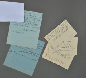 Auguste BARTHOLDI (1834-1904), sculpteur. 2 lettres et 4 cartes autographes signées, au docteur Goubert. 1896 et sans date. Correspondance amicale, réponse à des invitations aux dîners de La Marmite. " J'ai le regret de ne pouvoir venir ce soir, je suis pris par un bête de mal de dents qui m'ahurit [] ". Il lui indique sa nouvelle adresse sur d'Assas. " Je tiens à fêter notre ami Lépine ", etc.