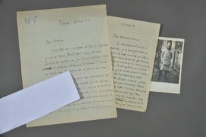 Jean-Richard BLOCH (1884-1947). 2 L.A.S. à " cher monsieur et ami " [Julien Luchaire (1876-1962), fondateur de l'Institut français de Florence]. Florence, 29 mai 1914 (2 pp. in-4) et [au front], 22 août 1914 (2 pp. in-8). De Florence, il vient d'apprendre qu'une des bourses David-Weill lui est attribuée. " Inutile de vous dire que j'en suis satisfait. Est-il convenable de remercier directement le donateur ? ". Il lui demande son adresse, donne des nouvelles de l'Institut et de ses élèves. Du front, 3 semaines après le déclenchement des hostilités. " En vous demandant de vos nouvelles, je ne peux guère vous en donner de moi une autre que celle-ci : je suis vivant, et ma foi, par le temps qui court, ce n'est pas un mince privilège. Si, il y a trente six heures, on m'avait dit que je vous écrirais ce mot à l'ombre d'une belle houblonnière, en toute tranquillité physique et morale, j'aurais pris ce propos pour une raillerie déplacée à l'égard des balles et des obus allemands qui pleuvaient sur notre 325°. Nous sommes loin d'en être revenus tous. Ceux qui se sont retrouvés jouissent doublement de la vie [] ". [Engagé dans le 325e régiment d'infanterie, il sera blessé à 3 reprises]. On joint une photographie de Bloch en tenue militaire, datée (octobre 1916) et signée au dos. Format carte postale.
