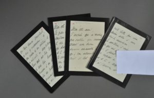 Georges HOENTSCHEL (1855-1915), décorateur et collectionneur, il fait partie du cercle rapproché de Marcel Proust, conçoit les intérieurs de Robert de Montesquiou, du duc de Gramont, de la comtesse Greffulhe ; il céda une grande partie de ses collections à John Pierpont Morgan. 4 lettres autographes signées à Robert de Montesquiou. 10 pp. in-8 sur papier de deuil. S.l.n.d. Traces de collage au verso du bord gauche des lettres. Petits cachets rouges de la collection Robert de Montesquiou. Charmante correspondance amicale après un deuil. " Je suis profondément touché de vos marques de sympathie et je n'oublierai jamais les jolies choses que vous m'avez dites avec tant de coeur et de souvenirs si justes. Je lis et relis votre lettre pour me laisser aller à mes tristes émotions. Je continue à vivre, c'est ce qui est le plus triste et il le faut ; tout à l'heure je repars en Allemagne et de là en Angleterre d'om j'arrive et entre ces absences je comte vous voir ". " Je voudrais savoir comment vous êtes et causer un peu avec vous. Que faites-vous ce soir, voulez-vous que je passe vous prendre ce soir vers 8 heures et que nous dinions ensemble ". " [] Je suis curieux de savoir ce que votre imagination toujours si en éveil a pu trouver de nouveau et de si personnel comme toujours. Comment êtes-vous ? Le silence a-t-il été rompu ? [) ".