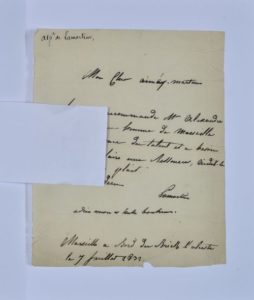 Alphonse de LAMARTINE (1790-1869). Lettre autographe signée à l'écrivain lyonnais Louis Aimé-Martin (1782-1847). 1 p. in-4. " Marseille, à bord du brick l'Alceste ", 7 juillet 1832. Départ pour son grand voyage en Orient. Au moment de partir, il lui recommande M. Alexandre Mez " jeune homme de Marseille qui annonce du talent et a besoin de s'en faire une ressource []. Adieu encore et mille bonheurs ".