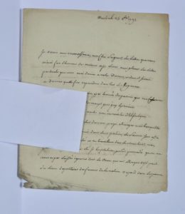 Dominique, cardinal de LA ROCHEFOUCAULD (1712-1800), archevêque d'Albi puis de Rouen, primat de Normandie, constituant, il s'oppose à la constitution et émigre en 1792. L.A.S. à Mgr Jérôme Champion de Cicé (1735-1810), ancien archevêque de Bordeaux, en exil. 2 pp. in-4. Maëstricht, 25 oct. 1792. Petite salissure et déchirure en coin. Après son départ en exil. Il a reçu la lettre pastorale donnée à son diocèse et souhaiterait qu'elle fût répandue dans l'ensemble du royaume. " Je suis icy depuis un mois, j'y ai trouvé des parents qui me consolent des pertes et des maux que j'ay éprouvés. J'ay trouvé dans ma route une immensité d'ecclésiastiques déportés qui vont chercher dans un pays étranger une tranquillité qu'ils n'auroient pas trouvé dans leur patrie ; les secours sont assez abondants et en charité et en travaillant dans le ministère ; mais jamais l'Angleterre n'a été si hospitalière, je suis persuadé qu'on ne vous a pas laissé ignorer tout le bien que M. l'Evêque de St Paul de Léon dépositaire des faveurs de la nation répand dans le pauvre clergé françois, séculier ou régulier [] ".
