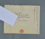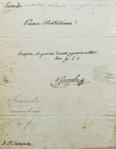 Jean-François SACOMBE (Carcassonne 1750-1822), médecin accoucheur et fou littéraire, auteur de la Luciniade. Pièce autographe signée adressée au " président de la classe des sciences physiques et mathématiques de l'Institut national, au Louvre ". 1 p. in-4, adresse au dos. A son " Praeses illustrimssime ", il dédie ce vers d'Horace, tiré du premier livre des Épitres : " Inspice, si possim donata reponere cultu. Hor. Ep. L. I ". Belle pièce. Rare.
