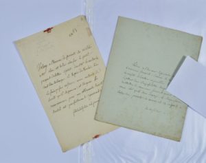 Constantin-François Chassebeuf, comte VOLNEY (1757-1820), philosophe et académicien. 2 lettres autographes (écrites à la 3e personne), l'une à M. Olive (Philadelphie, 14 janvier 1797), l'autre à M. Fenwick consul des États-Unis à Bordeaux (s.l. 20 messidor). 1 p. in-8 et 1 p. in-4. Sur son départ des États-Unis (il avait été reçu par George Washington, mais fut expulsé par John Adams, dès son élection, après qu'il ait critiqué le livre de la Défense de la constitution des États-Unis). Par une première lettre écrite de Philadelphie il adresse un paquet de lettres à faire passer en France " avec autant de sûreté qu'il se pourra ". Par une seconde lettre au consul des États-Unis, il l'informe qu'il sera dans l'impossibilité de le voir à cause de " l'arrivée de son bagage et la nécessité de le retirer aujourd'hui de la douane ".