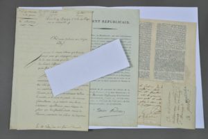 [BASTILLE]. 3 pièces relatives à Pierre-François PALLOY (1755-1835), démolisseur de la Bastille. - Xavier AUDOUIN (1765-1837), l'un des fondateurs du Club des Jacobins. Lettre signée à Palloy. 2 pp. in-folio. Paris, 29 septembre 1793. Il accuse réception de sa médaille et de ses imprimés. " J'en sens tout le prix et j'y ajoute tout celui que mérite un pareil ouvrage ; j'attends avec impatience ta déclaration des droits de l'homme [] ". - " Serment républicain " de Palloy signé par Xavier Audoin. 1 p. in-folio. Lui octroyant par ce même document une " médaille de fer provenant des chaînes de la Bastille ". 30 vendémiaire an 2. - Pièce signée par Palloy (ordre de délivrance pour le concierge du département), contrecollée sur un feuillet avec texte en anglais relatif à Palloy, sur lequel on a également fixé une enveloppe adressée à Palloy (portant la franchise postale de l'assemblée nationale).