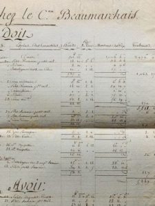 [BEAUMARCHAIS]. Grand tableau manuscrit, 48 x 36 cm. Détail de la vente des caractères typographiques de son imprimerie de Kehl à Panckoucke. À l'automne 1790, Beaumarchais, endetté, doit vendre sa Société littéraire typographique, imprimerie située dans le fort de Kehl, en Allemagne. Il fait rapatrier à Paris, pour y être vendus, les caractères typographiques et les poinçons qu'il avait acquis du fondeur anglais John Baskerville. Cet état des comptes de Panckoucke avec Beaumarchais, détaille les ventes faites d'octobre 1792 à octobre 1793. Sur deux colonnes, nous avons le détail de chaque transaction, avec les " espèces de caractères " (Cicero, points petit texte, petit romain petit oeil, petit texte corps fort, interlignes, St Augustin, gros Parangon, etc.) avec les quantités et les prix. Au dos, mention : " Caractères. Mémoire du Cen Panckoucke relevé le 25 pluviôse an 2 ", et d'une autre main : " du compte 8bre 1792 au 13 pluviôse an 2.4589-10-1 ". Très intéressant document.