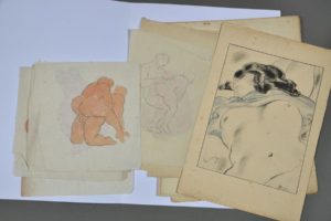 CURIOSA. 13 dessins anonyme, qui semblent d'une même main, première moitié du XXe. 7 dessins sur papier de Chine d'une même série, env. 17 x 17 cm, crayon et aquarelle (couple dans différentes positions). 2 dessins 23 x 18 cm, idem (couple). 4 dessins, fusain et aquarelle, 24 x 21 cm (femme seule). On joint 4 gravures érotiques, in-4, début XXe, dont une série de 3 (rousseurs) : la Chose impossible, le Diable de Papesiguière, le Fleuve Scamandre.