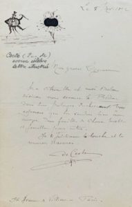 CURIOSITÉ. Lionel de CESTI (1846-1924), aventurier et escroc. Lettre autographe signée à " ma grosse légume ", illustrée d'un amusant dessin. 1 p. in-8. 8 nov. 1892. Très amusante missive à " ma grosse légume ". " Ma citrouille et moi melon désirons nous secouer le Bedon dans ton potager (?). Nous espérons que tu voudras bien nous envoyer deux feuilles de choux mâle et femelle pour entrer. Je te frictionne la bouche et te remercie d'avance ".