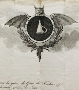 CURIOSITÉ. Brevet imprimé, XIXe, avec jolie décoration gravée (chauve-souris, tortue, éteignoirs, etc.). Pliures, petites effrangures, déchirures au pli central. Curieux brevet de chevalier de l'Ordre sombre de l'Éteignoir, resté vierge. " Misophane par la grâce du génie des Ténèbres [] ".