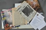 DE GAULLE. Ensemble de 3 albums contenant 91 photographies originales (quelques contretypes et quelques retirages) de dimensions variées, en N&B. Certaines avec cachet de photographe au dos (Daniel Camus, Paris Match, H. Roger-Viollet, etc.), la plupart sont légendées au dos. Très bel ensemble iconographique sur De Gaulle : un album consacré à sa visite en Algérie, un autre à la Libération, d'autres photos sur la formation du gouvernement, la visite de sinistrés, le passage en revue de troupes avec de Lattre de Tassigny, élections à Colombey en 58, avec Yvonne de Gaulle, avec Eisenhower, etc. Ainsi que la fameuse photo en Irlande et 2 de ses funérailles (cachets des photographes Patrice Habans et Roger Picherie et date du 12 novembre 1970). On joint une enveloppe contenant divers documents relatifs à De Gaulle dont 2 lettres adressées à lui à Colombey.