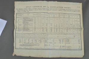ESCLAVAGE. Grand tableau imprimé, 40 x 50 cm, plié en 4. " État général de la population noire ; Des manufactures, bestiaux, cultures et denrées exportées en France, de chaque canton de la colonie de Saint-Domingue, partie française ; du 1er janvier au 31 décembre de la même année, établi dans le comptes des finances, rendu par M. Barbé de Marbois, intendant, et déposé au contrôle de la Marine à Port-au-Prince le 14 juillet 1789 ".