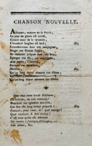 MARSEILLAISE (LA). Imprimé de 4 pp. in-8. Sans lieu ni date ni imprimeur. Taches anciennes, pliures. [Fin 1792 ou 1793]. Rarissime impression de la Marseillaise, qui ne porte pas encore ce nom, ni celui de " Chant de guerre pour l'armée du Rhin ", mais simplement " chanson nouvelle ". Elle ne figure dans aucune bibliographie ni aucun catalogue, pas même dans l'ouvrage de Le Roy de Sainte-Croix, Le Chant de guerre pour l'armée du Rhin ou la Marseillaise, étude de plus de 200 pages, consacrée à ce sujet. Il comprend le 7e couplet dit " Couplet des enfants " ajouté en octobre 1792, placé ici en 5e couplet. Et un dernier couplet qui n'eut qu'une existence très éphémère : " Que l'amitié, que la Patrie / Fassent l'objet de tous nos voeux ; / Ayons toujours l'âme nourrie / Des feux qu'ils inspirent tous deux ; / Soyons unis, tout est possible, / Nos vils ennemis tomberont, / Alors les Français cesseront / De chanter ce refrain terrible / Aux armes, &c. ". Ce dernier couplet existe également sur une feuille in-8 (avec musique) publiée après le 14 octobre 1792, chez Frère, passage du Saumon. Notre imprimé comporte aussi quelques variantes par rapport au texte définitif : " Entendez-vous dans nos [les] campagnes ", " Formez vos bataillons, marchez [marchons, marchons], qu'un sang impur abreuve vos [nos] sillons ", puis une répétition aujourd'hui absente " marchons, marchons, qu'un sang impur abreuve vis sillons " ; " C'est vous [nous] qu'on ose menacer [méditer] " ; " Français, pour vous [nous], ah ! quel outrage ! " ; " S'ils tombent nos jeunes héros, La France [terre] en produit de nouveaux, Contre vous tout est prêt [tous prêts] à se battre ".