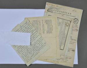 RÉVOLUTION. 10 documents concernant le service de François Logerot au sein de la Force Armée Parisienne, 1789-1794. - 6 ordres de la " Garde-bourgeoise " (août 1789) puis de la " Force Armée Parisienne " et de la " section armée du Mont-Blanc " pour prendre des gardes dans différents secteurs de Paris. - 3 certificats : de don pour la collecte des volontaires de la Vendée, de non inscription sur la liste des émigrés, de vie par la Section du Mont-Blanc. - Lettre de l'intéressé au Comité révolutionnaire détaillant sa situation.