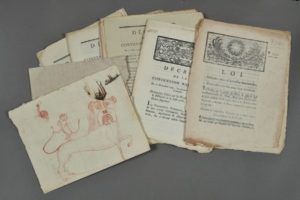 RÉVOLUTION. 17 imprimés révolutionnaires. Loi et décrets : " Loi relative aux cocardes nationales " ; décret " relatif aux inscriptions des monumens publics " ; décret " concernant ceux qui peuvent être réputés chefs des émeutes & révoltes contre-révolutionnaires " ; décret " portant qu'il ne sera plus fait usage du papier marqué des anciennes empreintes portant les attributs de la Royauté " ; loi " portant qu'il sera élevé dans toutes les communes un Autel à la Patrie " ; décret " qui institue des fêtes décadaires " ; décret " qui règle la conduite des généraux françois dans l'exercice du pouvoir révolutionnaire dans le pays Batave " ; décret " contenant proclamation aux Bataves " ; " arrêté relatif au Livret dont les ouvriers travaillant en qualité de compagnons ou garçons, devront être pourvus " ; " arrêté du Directoire exécutif qui prescrit des mesures pour la stricte exécution du calendrier républicain ", etc. ainsi que 3 affiches sur les maisons religieuses, les émigrés et la vente des biens nationaux.