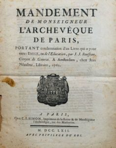 [Jean-Jacques ROUSSEAU]. Brochure de 8 pp. in-4 [sur 20]. Imprimée à Paris, chez C.F. Simon, imprimeur de la reine et de l'archevêque, 1762. Rousseurs, rognures en marge gauche. Mandement de monseigneur l'archevêque de Paris portant condamnation d'un livre qui a pour titre : Émile, ou de l'éducation, pat J. J. Rousseau, citoyen de Genève. Rare imprimé de condamnation de l'Emile, malheureusement incomplet.