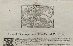 VENISE. Affiche imprimée, 42 x 31 cm. 1606. Belle et grande vignette gravée sur bois à l'effigie du Lion de Venise. Belle et rare affiche du doge Leonardo Donato (1536-1612), qui fut doge à partir de janvier 1606, " data nel Nostro Palazzo" le 6 mai 1606.