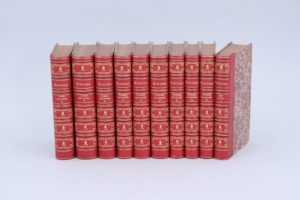 407 pages. Mémoires de Messire Pierre de Bourdeille, Seigneur de Brantôme, contenans les Vies des Dames Galantes de son temps. Leyde, Jean Sambix [Amsterdam, A. Wolfgang], 1666. 2 vol. petit in-12, (4 ff), 424 pages et 504 pages. Mémoires de Messire Pierre de Bourdeille, Seigneur de Brantôme, contenans les vies des hommes illustres et grands capitaines françois de son temps. Leyde, Jean Sambix [Amsterdam, Daniel Elzevier pour les tomes II, III etIV] 1666. 4 vol. petit in-12, (3 ff), 388 pages ; (2 ff), 404 pages ; (2 ff), 442 pages ; ( 2 ff), le second blanc, et 352 pages. Mémoires de Messire Pierre de Bourdeille, Seigneur de Brantôme, contenans les vies des hommes illustres et grands capitaines estrangers de son temps. Leyde, Jean Sambix [Bruxelles, Foppens] 1666. 2 vol. petit in-12, (4 ff), 304 pages ; 300 pages. Oeuvres du Seigneur de Brantome, nouvelle édition ... tome onzième contenant le Discours sur les Duels. La Haye [Rouen], Aux dépens du Libraire, 1740. Petit in-12, (2 ff), frontispice et 383 pages. 10 volumes petit in-12, 1/2 chagrin cerise, dos très orné. Reliure du milieu du XIXème siècle. (On joint : ) Mémoires de Messire Pierre de Bourdeille, Seigneur de Brantome, contenant les anecdotes de la Cour de France. Leyde, chez Jean Sambix. 1722. Petit in-12, plein veau fauve ; roulettes intérieures ; toutes tranches dorées. Reliure anglaise du début XIXème. (Légère fragilité à un mors). Edition originale, publiée près de 60 ans après les autres volumes, mais qui s'annexe à la collection, bien que parfaitement indépendant. Ex-libris Ch. Jac. Stuart et Mary Briant Sprague. (Thim : Bibliography of fencing and duelling, page 37.) Soit, en tout, 11 volumes. Bel exemplaire des Mémoires de Brantome. Tous les volumes -sauf le Discours sur les Duels - portent l'adresse de Jean Sambix le Jeune, à Leyde, et la sphère elzévirienne. Ils sont tous conformes aux descriptions et collations des éditions originales décrites par Tchemerzine et Willems, excepté le tome I des Hommes Illustres et grands Capitaines François (388 pages au lieu de 417 pages) et le Discours sur les Duels qui forme le tome XI des Oeuvres de 1740. "Cette édition des Oeuvres de Brantome, qui est l'originale, a été exécutée aux frais des frères Jean et Daniel Steucker à La Haye ... En 1665, les frères Steucker n'étaient encore que libraires. Ils se sont adressés pour imprimer leur Brantome aux premiers typographes du temps, Daniel Elzevier, Fr. Hackius et Foppens..." (Willems) (Tchemerzine, pages 110 à 117 ; Willems, Les Elzeviers, n°1369 ; Berghman, Remarques sur diverses éditions elzéviriennes, n°459)