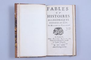 attribuées -à tort- à La Fontaine, qu'elle fréquentait, par les bibliographes du XIXème siècle, assurément peu féministes. Madame de Villedieu a publié une quarantaine de pièces poétiques, fables, nouvelles ou romans qui rencontrèrent un grand succès. L'ouvrage est publié chez Barbin, comme les Fables choisies de La Fontaine en 1668. Intéressante mise en pages : les 6 premiers feuillets (Dédicace) ont 9 lignes par page ; les autres pages, au plus 15 lignes