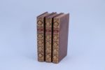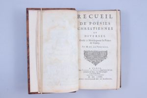 Frontispice, (6 ff), 424 pages et (4 ff). Tome III : Frontispice, (4 ff), 368 pages. Plein veau, dos orné. Reliures pastiches, bien exécutées. Recueil formé par Loménie de Brienne, contenant 24 pièces de La Fontaine et 16 fables, avec des poèmes de Malherbe, Arnaud d'Andilly, Racan, Mademoiselle de Scudéry, Voiture, Benserade, Perrault, Segrais, Brebeuf, Corneille, Théophile de Viau, Saint-Amand, Scarron, Racine, etc... Edition originale des 3 volumes, avec achevé d'imprimer du 20 décembre 1670. L'édition a été commandée par Port-Royal à Loménie de Brienne, et achevée par La Fontaine. La Fontaine avait de solides liens d’amitié avec les gens de Port-Royal, comme Arnaud d’Andilly, poète comme lui. C’est pourquoi on lui demanda, en 1671, d’apposer son nom prestigieux à une anthologie de poèmes réunis par les Solitaires dans le cadre de leurs publications pédagogiques, ce Recueil de poésies chrétiennes et diverses. (Rochambeau, n°3, pages 607-608. Tchemerzine, Vi, 398.)