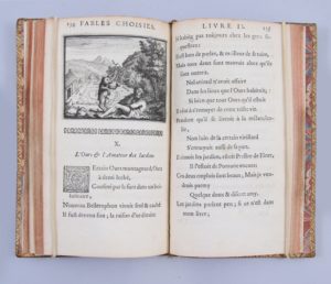 marge de queue des pages 50-51 et 53-54. Piqûre de ver bénigne circulant dans la partie haute du volume.) Ce troisième tome des Fables choisies contient 3 fables déjà publiées en 1671, 41 fables en édition originale, et l'Epistre à Madame de Montespan. Il est publié du vivant de La Fontaine, qui en supervise l'impression. Il est illustré de 44 gravures sur cuivre signées F.C. (François Chauveau), N.G. (Nicolas Guérin), ou non signées. Second tirage, selon Tchemerzine, avec le 7ème vers de la page 101 restitué entre parenthèses. (Rochambeau, n°5, pages 4 et 5.. Tchemerzine, VI, p. 387)