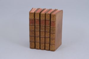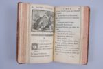 (IV) A Paris, Denys Thierry et Claude Barbin, 1679. Fables choisies, mises en vers par M. de La Fontaine. (V) contenant le XII. Livre A Paris, Par la Compagnie des Libraires, 1709. 5 volumes in-12. Dimensions intérieures : 149 X 84 mm. Plein veau fauve, dos à 5 nerfs orné aux petits fers dans les entre-nerfs ; pièce de titre de maroquin rouge. Elégante reliure du milieu du XVIIIème siècle. (Restauration ancienne à quelques coiffes ; restauration à 2 coins du tome I et à son mors supérieur. Quelques légères rousseurs et salissures. Quelques auréoles saines dans le tome III. 5 petits manques de papier marginaux dans le tome I, et une piqûre n'affectant pas le texte dans le tome V, ont été comblés anciennement). Collation : Tome I (1678) : (32 ff) dont le titre aux armes du Dauphin, 216 pages., (1 f. d'errata). Tome II (1678): 232 pp, (2 ff). Tome III (1678) : faux-titre, titre, 3-220 pages. Tome IV (1679) : titre, 3-221 pages, (1 f). Tome V (1709) : (5 ff), 238 pages. Edition originale collective des Fables de La Fontaine (excepté pour le tome V). Les tomes I et II reprennent les 6 livres de l'édition de 1668 en 2 vol. in-12, avec 60 et 58 gravures de Chauveau. Le tome III renferme trois Fables déjà publiées en 1668, 41 Fables nouvelles, et l'Epistre à Mme de Montespan. Il est illustré de 44 gravures. Le 7ème vers de la page 101 est présent, entre parenthèses. Le tome IV présente cinq Fables déjà publiées en 1671, et 39 fables nouvelles avec un Epilogue. Il est illustré de 44 gravures. A la fin de la page 20, "N'ont que l'habit pour tous talens", signe de 2ème tirage selon Tchemerzine. Ces quatre premiers volumes ont été imprimés et corrigés sous la direction de La Fontaine. Le tome V est celui de l'édition Charpentier de 1709, à l'adresse de la Compagnie des Libraires, avec 29 Fables (numérotées 28 : il y a 2 fables numérotées 27) et 29 gravures. A la fin du tome III, est insérée une fable manuscrite, en 20 vers,, d'une écriture du XVIIIème siècle, intitulée "L'homme et les deux chevaux" : "Un homme avait deux bons chevaux L'un robuste, solide, allait à la voiture L'autre, léger, lui servait de monture. Tous les deux étaient bons mais n'étaient pas égaux". Tous les volumes portent les ex-libris manuscrits du XVIIIème siècle de Mademoiselle de Chastel, ou de Castel, dont un daté 1770 ; et du Comte de Chateauneuf. (Rochambeau, n°5 page 4 pour les tomes I, II, III, IV, et n°48, page 21, pour le tome V. Tchemerzine, VI, page 387 pour les tomes I, II, III, IV)