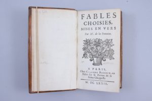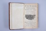 Claude Barbin, au Palais sur le Perron de la Sainte Chapelle. 1682. 2 vol. in-12, veau moucheté du temps ; dos à 4 nerfs orné au petit fer dans les caissons. Premier volume : (36 ff), 155 pages. Tome second : (3 ff), 174 pages. Le premier volume, daté de 1679, contient 124 Fables. Il ne porte pas d'indication de tomaison sur la page de titre. Le titre courant de la 5ème page de l'Epistre à Monseigneur le Dauphin contient une coquille : "Epistae" pour "Epistre". Ce volume, avec cette collation, à la date de 1679, manque à Rochambeau, Rochebilière et Tchemerzine. Nous ne trouvons qu'un exemplaire recensé, à la Bibliothèque de l'Université de Mannheim, mais aucun en France. Le Tome second contient 88 Fables. Il appartient à l'édition des Fables décrite par Rochambeau sous le n°17, en 3 volumes (1682, 1682 et 1694). Bel exemplaire. Nous joignons, dans une reliure différente et émoussée du temps, les "Fables choisies mises en vers par Mr de La Fontaine, tome premier", Claude Barbin, 1682, avec la même collation que le volume de 1679. La coquille du titre courant de l'Epistre est corrigée, et le titre porte "tome premier". La "Table des Fables " est devenue "Table des Fables contenues en cette Première partie". Le bois "au panier fleuri" qui figure sur le titre en 1679, est remplacé sur le titre daté 1682 par un bouquet de tulipes et d'artichauts ; le bois "au panier fleuri" est placé à la fin de La Vie d'Esope. (Rochambeau, pour les volumes datés de 1682, n°17, page 10)