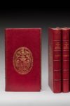 (158 X 90 mm), plein maroquin cerise, armes du Marquis de Villoutreys de Brignac, dos à 5 nerfs, fer aux pointillés sur les coupes, roulettes sur les chasses. Toutes tranches dorées. Reliure parfaitement établie vers 1860. (Très discrète restauration à un mors du tome VIII ; manque marginal de papier corrigé aux pages 207-208 du tome III. Mouillure saine dans l'angle supérieur des cahiers P et Q du tome VI) Très bel exemplaire, nonobstant les défauts signalés. Première édition collective, et première édition illustrée, riche de 30 figures en taille-douce gravées par J. Sauvé, d'après les dessins de Brissart. Elle comprend six pièces en édition originale, dont le libraire avait acquis les manuscrits d'Armande Béjart, veuve de Molière : Don Garcie de Navarre, L'Impromptu de Versailles, Don Juan ou le Festin de Pierre, Mélicerte, Les Amours magnifiques et La Comtesse d'Escarbagnac. Les éditeurs en sont deux amis intimes de Molière : Vinot, et le comédien et secrétaire de la troupe Charles Varlet de la Grange, dit Lagrange, représenté en scène par Brissart dans le rôle de Don Juan (tome VII, page 128). La Préface est riche de renseignements sur la vie de Molière, et l'histoire de la troupe. "Cette édition doit être considérée à juste titre comme la plus complète des éditions du XVIIème siècle. Les jeux de scène y ont été introduits, et pour la première fois chaque comédie est précédée d'une gravure particulièrement précieuse pour les attitudes et les costumes des personnages. (J. Guibert). Exemplaire cartonné, dit de seconde émission. Les exemplaires non cartonnés sont d'une très grande rareté : Rochébilière n'en connaît que 4 -dont le sien. Exemplaire aux armes du Marquis Ernest de Villoutrays de Brignac (1830-1906), diplomate et grand bibliophile. (Olivier, Hermal, Roton, pl. 351) Une note manuscrite au crayon attribue avec vraisemblance la reliure à l'atelier Belz-Niédrée. (Tchemerzine, VIII, 358-359 ; Rochebilière, n°366 pour un des rarissimes exemplaires sans les cartons ; Le Petit, Bibliographie des principales éditions originales des écrivains français, pages 326-334 ; J. Guibert, Bibliographie des Oeuvres de Molière publiées au XVIIème siècle, CNRS éd., p. 612)