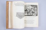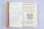 Frontispice, (8 ff), 236 pages ; tome II : (4 ff), 216 pages. Plein maroquin orange ; trois filets droits et un filet au pointillé d'encadrement, fleurons au pointillé dans les angles. Dos à 5 nerfs soulignés d'un filet au pointillé ; riche décor de fers au pointillé dans les caissons ; pièces de titre de maroquin vert. Filet double sur les coupes. Large rinceau intérieur, bordé de filets droits et hachurés. Toutes tranches dorées. Reliure parfaitement établie vers 1860, signée Hardy. Très bel exemplaire de l'édition originale de la première édition collective et première illustrée des Contes, avec toutes les remarques de premier état -il existe 3 tirages à la même date- notées par Tchemerzine, Rochambeau, Brunet ou Rochebilière. Frontispice et 58 très fines gravures sur cuivre de Romain de Hooghe, à mi-page, en superbes épreuves, remarquablement contrastées. La page 175 du tome II est chiffrée par erreur 171. (Tchemerzine, VI, 375 ; Rochambeau, n°28 page 511 ; Brunet, III, 759 ; Rochebilière, n°157)