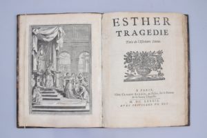 d'après Chauveau, 83 pp et (1 p.) pour la fin du Privilège. Plein veau du temps. (Marge intérieure du frontispice et du titre doublée. Déchirure horizontale réparée sur le feuillet A4. Taches roussâtres sur plusieurs feuillets, sans doute provoquées par une tentative ancienne de suppression de salissures ou d’inscriptions manuscrites.) Edition originale, partagée entre Claude Barbin et Denys Thierry. La pièce, commandée à Racine par Mme de Maintenon, fut jouée pour la première fois le 26 janvier 1689 à la Maison Royale de Saint-Louis, à Saint-Cyr, ouverte en 1686, pour l'instruction des jeunes filles de la noblesse pauvre. Esther fut donnée en présence de Louis XIV, de Madame de Maintenon et de nombreux courtisans. Les jeunes filles qui jouèrent cette pièce reçurent de Madame de Maintenon des costumes ornés de diamants et de pierres précieuses. Les décors furent créés par Borin, le décorateur des spectacles de la cour, et la musique de la pièce était jouée par les Musiciens du Roi. La préparation de la représentation coûta au total plus de 14 000 livres. Les courtisans se pressaient au spectacle. Le Privilège, accordé le 3 février 1686 aux Dames de la Communauté de Saint-Louis, est cédé le 18 février 1689 à l'imprimeur et marchand-libraire Denys Thierry. Note du temps sur la dernière garde volante : "Ce présent livre apartien à madame Leroy, rue Royale à Versailles. Ceux ou celles qui le trouveront auront la bonté le randre à madame Le Roy bourgeoise de Versailles, et ceux qui auront la bonté de la raporter à Madame Leroy ... auront .... récompense." (Tchemerzine, IX, 347)
