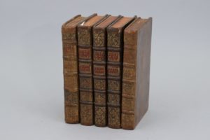 (3 pp) ; tome III : (4 ff) et 214 pp ; tome IV : (3 ff) et 227 pp ; tome V : (5 ff) et 238 pp. Veau brun du temps. (Les tomes I et V ont des fers légèrement différents ; leurs ors sont ternis. Petites restaurations anciennes aux coiffes. Quelques légères rousseurs). Le Privilège, accordé à Trabouillet le 18 septembre 1692 et cédé à 6 libraires parmi lesquels Charpentier et David, ainsi que l"Achevé d'imprimer daté du 22 mars 1697, se trouvent dans le tome II. Cette édition est ornée des vignettes à mi-page de Chauveau, non signées. Deux figures ont été collées au recto et au verso de la première garde volante. (Rochambeau, n°48 et 49, pages 21-22)