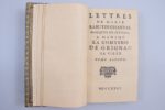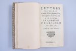 Préface et (1 f) d'errata ; titre, 324 pp, et (1 f) d'errata. Plein maroquin bleu-nuit, décor à la Du Seuil sur les plats, avec 6 filets d'encadrement ; dos très ornés ; deux filets droits sur les coupes ; large encadrement intérieur, composé de 2 roulettes, d'un filet au pointillé et de 2 filets droits. Toutes tranches dorées. Reliure fin XIXème, signée Motte. "Seconde édition originale, dite de Rouen, en gros caractères ... Elle a été publiée par Thiriot, l"ami et le correspondant de Voltaire, d'après un manuscrit appartenant à l'abbé d'Amfreville. Elle a été imprimée clandestinement à Rouen. Les deux feuillets d'errata manquent souvent." (Tchemerzine). Elle contient 78 Lettres, dont 74 à la Comtesse de Grignan. Très bel exemplaire, relié par Alphonse Motte, successeur de Trautz-Bauzonnet. Bien complet des feuillets d’errata. (Tchemerzine, X, page 319. Rochebilière, n°671.) L’édition originale des Lettres, publiée à Troyes chez Lefèvre en 1725 (in-12, 75 pages) ne renferme que 31 lettres ou fragments. Elle « est de la plus grande rareté et on n’en connait que quelques exemplaires » (Tchemerzine, X, page 318). Elle manque d’ailleurs à Rochebilière. Il existe 4 éditions sous la date de 1726, toutes rares, mais toutes présentes dans la Bibliothèque de M. T***, parfois en 2 exemplaires.