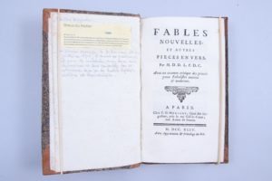 DREUX DU RADIER, Jean-François (1714-1780). Fables nouvelles et autres pièces en vers. Pa M.D.D.L.P.D.C. Avec un examen critique des principaux fabulistes anciens et modernes. Paris, Mérigot, 1744. In-12, XXVI et 101 pages, (1 f). 1/2 veau du...