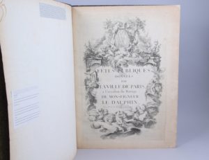 LIVRE DE FETES. Fêtes publiques données par la Ville de Paris à l'occasion du Mariage de Monseigneur le Dauphin les 23 et 26 février 1745. (Paris 1745) Grand in-folio. Dimensions intérieures 625 X 450 mm. Modeste 1/2 percaline vers 1850. (Titre...