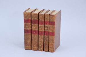 roulette à motif floral ; dos sans nerf, orné d'un fer réticulé et d'un fer à la grappe de raisins, pièces de titre et de tomaison de maroquin rouge.. Charmante reliure établie vers 1800. (Habile restauration à la coiffe supérieure des tomes I et V). "Edition la plus complète de cet ouvrage ; elle est ornée de jolis titres gravés de Choffard. Cette édition est en réalité un recueil qui contient l'Histoire amoureuse de Bussy et diverses pièces ayant déjà paru en Hollande, mais qui sont d'autres auteurs."(Tchemerzine). L'ouvrage renferme entre autres l'Histoire amoureuse des Gaules, les Maximes d'Amour, les Amours de Mademoiselle de La Vallière, les Amours de Madame, Les vieilles Amoureuses, les Amours de Madame de Montespan, les Amours de Mademoiselle, les Amours de Madame de Maintenon etc... et dans le tome V, "La France devenue Italienne", qui commence par ces mots :"La facilité de toutes les dames avait rendu leurs charmes si méprisables"... Bon exemplaire. (Tchemerzine, III, page 160)