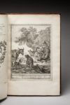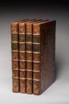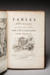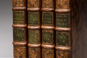 veau porphyre, triple filet à froid d'encadrement, dos très orné, pièces de titre et de tomaison de maroquin vert, tranches jaspées. Reliure du temps. (Mors habilement restaurés. Quelques petites taches marginales effacées, en particulier au tome II sur la figure vis à vis de la page 70, et au tome III, pages 17 et 29). Tome I : (2ff), XXX et XVIII pages, 124 pages. Tome II : (2 ff) et 135 pages. Tome III : (2ff), IV pages, 146 pages. Tome IV : (2 ff), II pp. 188 pp. Au début du tome I, se trouve une Vie de La Fontaine, par Regnard de Montenaut, éditeur de l'ouvrage qui avait acquis les dessins de Jean-Baptiste Oudry. L'ouvrage est illustré de 276 planches hors-texte dont le frontispice, d'après les esquisses de Jean-Baptiste Oudry, redessinées à la mine de plomb par Charles-Nicolas Cochin, protégé de Mme de Pompadour, et gravées sur cuivre par 42 graveurs, parmi lesquels Fessard, Aubert Aveline, Tardieu, Chedel, etc... qui travaillèrent sous sa direction. S'y ajoutent 203 culs-de-lampe, à motifs floraux ou allégoriques, certains de grand format, gravés sur bois par Le Sueur et Papillon C'est assurément le projet le plus ambitieux -et le plus coûteux- du siècle pour illustrer une oeuvre littéraire. L'entreprise dura 9 ans, et on dut faire appel pour la mener à bien à l'aide financière de l'Académie Française, de la Cour, et du Roy. Bon exemplaire de premier tirage, sur vergé de Hollande. "On doit signaler ... un premier état de la 2ème gravure de la fable "Le Singe et le Léopard" : la banderole fixée à la cage du Léopard ne porte aucune inscription. Les exemplaires contenant cette épreuve [tome III, page 113] sont très recherchés, comme étant de premier tirage. " (Rochambeau). C’est le cas ici. "Les 275 dessins de Jean-Baptiste Oudry vont donner naissance à l'édition la plus prestigieuse et la plus copiée du siècle, et à de très nombreuses déclinaisons dans les arts décoratifs" (Lesage). (Rochambeau, n°86 ; Cohen, 5ème édition, col. 301-302. Lesage, La fortune des fables au XVIIIème siècle, pages 160 à 165)
