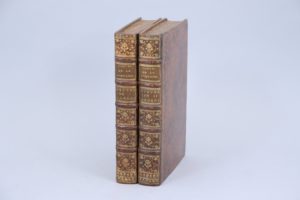 pp. (2 ff), 8 pages numérotées 9-16.. Plein veau raciné. Triple encadrement de filets droits. Dos à 5 nerfs soulignés d'un fer hachuré ; décor à la grenade dans les caissons ; filet sur les coupes ; roulettes intérieures. Toutes tranches dorées. Reliure du temps. (Habiles restaurations aux mors. Notes au crayon sur la première garde blanche. Rousseurs sur les faux-titres et les gardes blanches. ) Même ouvrage que le précédent, dans une reliure du temps en veau, bien établie. Les six "figures découvertes" sont présentes. "Superbe édition au point de vue iconographique et typographique, éditée à Paris par Barbou, aux frais des Fermiers Généraux". (Rochambeau.) (Cohen, col. 306-307 ; Rochambeau, n°79, page 525 ; Tchemerzine, VI, pp. 378-379)
