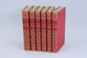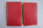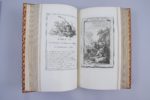 graveur ordinaire du Cabinet du Roy et de l'Académie de Parme. 1765-1775. 6 volumes in-8. Dimensions intérieures : 200 X 125 mm. Tome I : (titre recto-verso), LXXI et 100 pages. Tome II : VI et 102 pages . Tome III : IV et 95 pages. Tome IV : (2 ff) et 134 pages. Tome V : (2 ff) et 103 pages. Tome VI : (2 ff) et 115 pages. Plein maroquin rouge, triple filet d'encadrement ; dos à 5 nerfs, soulignés d'un filet droit ; riche décor d'arabesques dans les caissons ; filet double sur les coupes ; large rinceau intérieur, bordé de 3 filets variés. Toutes tranches dorées sur marbrure. Reliures parfaitement établies vers 1870, qu'une note manuscrite convaincante de M. T*** attribue à Thibaron-Joly. Premier tirage, bien contrasté, de cet ouvrage entièrement gravé. Un des exemplaires de luxe imprimés sur papier de Hollande. Il est illustré de 6 titres gravés, d'un frontispice, de 243 figures hors-texte, de 243 vignettes et de 226 culs-de-lampe gravés par Fessard d'après Houel, Monnet, Leprince, Loutherbourg, etc... Le texte est entièrement gravé par Montulay. Tous les volumes portent comme adresse "chez l'auteur", excepté le tome IV, "chez l'auteur, chez Durand, et chez Deslauriers" Exemplaire enrichi des 276 gravures de Punt et Vinkeles, tirées sur beau vergé, belles réductions des gravures d'Oudry pour l'édition des Fables à l'adresse de Leiden et Amsterdam, commencée probablement vers 1761. "Commencée en 1761, cette édition traîna sans souscripteurs et sans succès. Le second volume ne parut que 3 ans après, le troisième 9 ans, .le quatrième 14 ans, les deux derniers 25 ans seulement après le premier" (Rochambeau, n°99). Tous les bibliographes (Lacroix, Rochambeau, Cohen) s'accordent pour dire que "le texte [de l’édition de Leiden] est détestable comme impression et comme incorrection" -mais que les gravures sont d'une grande finesse. En tête du vol. I, est placé le frontispice de Vinkeles, d'après Buys, daté 1786 - et mis en vente en 1803... Comme le remarque Cohen (col. 302), qui date cette édition de 1784-1786, "toutes les gravures de cet ouvrage sont très belles". Il ajoute pour tout simplifier que "les exemplaires portant ... la date de 1802 sont de premier tirage". (Rochambeau, n°99, pages 36 et 37 et n°101, pages 37 à 40. Cohen, col. 302-303. Tchemerzine, VI, p. 392)
