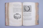 trouve à Paris, chez Le Boucher, libraire. 1773. (A la suite :) Héro et Léandre, poème de Musée. On y a joint la traduction de plusieurs idylles de Théocrite. Par M. M***C**. A Sestos, et se trouve à Paris, chez Le Boucher, libraire. 1774.; Grand in-8. (Dimensions intérieures : 221 X 141 mm). IV et 280 pages ; XVI et 104 pages. Plein veau porphyre, triple encadrement de filets dorés, petit fer à motif floral aux intersections ; dos orné du fer à la grenade ; pièce de titre de maroquin rouge. Double filet sur les coupes, roulette intérieure. Toutes tranches dorées. Parfait exemplaire, imprimé sur un vergé fort de Hollande. L'ouvrage est illustré en premier tirage de 2 figures-frontispices par Eisen, gravées par Massard et Duclos, de 12 vignettes et 13 culs-de-lampe par Eisen, gravés par Massard "L'un des livres les plus élégamment illustrés du XVIIIème siècle. " (Cohen, col. 25).