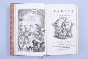 DORAT, Cl. Joseph (1734-1780). Fables nouvelles. A La Haye, et se trouve à Paris, 1773. 2 tomes en 1 vol. in-8. Plein maroquin rouge janséniste. Filet sur les coupes. Large dentelle intérieure soulignée de 3 filets. Tête dorée. Reliure de la...