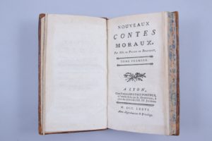 LE PRINCE DE BEAUMONT, Jeanne-Marie (1711-1776). Nouveaux Contes Moraux. Par Mde Le Prince de Beaumont. Lyon, Pierre Bruyset Ponthus, 1776 2 vol. in-12, IV et 252 pages ; 234 pp. et (2 ff). Plein veau raciné du temps. Edition originale. Sur Madame...