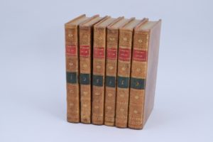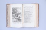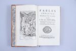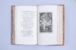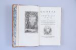 CVI pp, (1 f), 118 pages. Tome II : 129 pages. Tome III : I-VI et 7-169 pages. Tome IV : 212 pages. Pleine basane blonde flammée, 2 filets d'encadrement sur les plats, dos sans nerf orné de croisillons de filets au pointillé avec une feuille de chêne en leur centre ; pièces de titre et de tomaison de maroquin rouge et vert ; filet sur les coupes. Toutes tranches dorées. Elégantes reliures du temps.(Petits défauts de couleur sur le second plat du tome III) Cette édition contient 246 fables par suite de l'adjonction au Livre XII de 5 fables, dont la Matrone d'Ephèse. Elle est illustrée de 247 gravures hors-texte, réductions in-8 des illustrations d'Oudry. (Rochambeau, n°109, page 42) (Sont joints :) Contes et Nouvelles en vers par Jean de La Fontaine. Tome premier (-second) 1777 (Sans lieu) 2 volumes in-8. Tome I : Frontispice, (2 ff), XIV et 200 pages. Tome II : Frontispice, VII et 286 pages. Reliures du temps, strictement identiques à celles des Fables. "Cette édition est copiée sur celle des Fermiers Généraux ; elle est ornée des 83 figures d'Eisen, grossièrement gravées en contrepartie, de frises, de fleurons et de 38 culs-de-lampe". (Rochambeau) (Rochambeau, n°90 page 538, indique dans le tome I un Avis du libraire pour le placement des gravures qui n'a jamais figuré dans cet exemplaire. Il ignore que cette édition est une impression de Bouillon) Rare réunion, dans des reliures du temps homogènes, des Fables et des Contes publiés à Bouillon, clandestinement, par Pierre Bouillon. Bel exemplaire, exempt de rousseurs.
