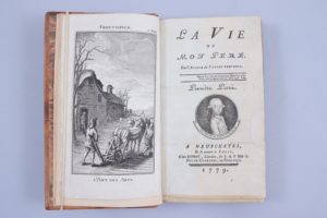 RESTIF DE LA BRETONNE, Nicolas-Edme. La vie de mon père. Par l'auteur du Paysan perverti. A Neufchâtel, et se trouve à Paris chez Esprit; Libraire de S.A.S Mgr le Duc de Chartres. 1779. Deux parties en 1 vol. in-12, (4 ff), 152 pp ; 139 pp et (3...