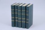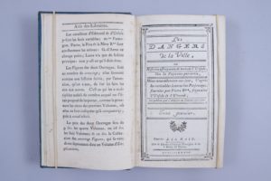 par Pierre R**, frère aîné d'Ursule et d'Edmond. Et publiée par l'auteur du Paysan perverti. Imprimé à La Haie. Et se trouve à Paris chez le libraire indiqué au Frontispice de la I partie du Paysan. 1784. 8 parties en 4 volumes, et 1 volume d'Explications des figures ; soit 5 volumes in-12, cartonnage Bradel vers 1800. (3 ff) dont frontispice, 344 pages. Frontispice et 320 pp, y compris faux-titre et titre, chiffrées 220. Frontispice et 320 pp, y compris faux-titre et titre. Frontispice et 344 pages, y compris faux-titre et titre. [A la fin du tome IV, sont reliés l"Avis sur les Dangers de La Ville ou Paysan et Paysane pervertis", 6 pages, la "Revue des Ouvrages de l'auteur", paginée CLXIX-CCXLIV, et le catalogue des "Ouvrages du même auteur qui se trouvent à Paris chez la Veuve Duchêne, ... et la Veuve Esprit", 6 ff.] Volume des Figures : CLXVIII pages, et LXXXII pages. (Quelques habiles restaurations dans l'angle de quelques feuillets, loin du texte). Bel exemplaire de l'édition originale de La Paysane Pervertie, bien complet des 38 figures de Binet (alors que seules 36 sont indiquée sur la table), dont les figures supplémentaires III bis et VIII bis, destinées à remplacer les figures III et VIII, jugées trop libres, et bien présentes dans l’exemplaire. Deux feuillets, numérotés XV à XVIII, expliquant ces deux nouvelles figures, sont intercalés entre la page VI et la page VII des figures de la Paysane pervertie. La censure ayant ordonné la suppression du titre de ce roman, "il a été recouvert par un nouveau titre soigneusement collé dessus, ainsi que sur le faux-titre, pour faire disparaître les mots Paysane Pervertie, qui ne sont restés que sur les frontispices gravés". (Jacob). Les cahiers reliés à la suite de la page CCCXLIV du tome IV se trouvent généralement à la fin du recueil de Figures. (Jacob, XXVIII, pages 224 à 232. Rives-Child, XXIX, n°1, page 289)