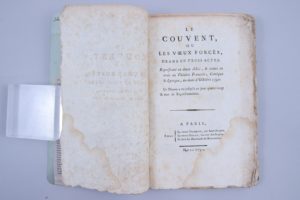 quatre vingt et tant de représentations. Paris, chez la veuve Duchesne, la veuve Bailly et chez les Marchands de Nouveautés. Mars 1792. In-8, (2 ff), XI et 83 pages; (1 f. blanc). Broché, non rogné, partiellement non coupé. Couvertures d'attente. (Fortes mouillures saines ; rousseurs). Le faux-titre porte :"Le Couvent ou les Voeux forcés, drame en trois actes, par Mme de Gouges, Auteur de L'Esclavage des Noirs.". Edition originale très rare de cette pièce pamphlétaire écrite par Olympe de Gouges pendant les débats à l'assemblée sur l'abolition des voeux monastiques et la suppression des couvents. "Il falloit donner l'essor à la grande question qui s'agitoit à l'Assemblée Nationale. Ma pièce pouvoit peut-être y contribuer" (Préface, p. III). Pionnière du féminisme en France, auteure de la Déclaration des Droits de la Femme et de la Citoyenne (1791), ardente défenseuse de la cause des Noirs, Olympe de Gouges est guillotinée à Paris le 2 novembre 1793.